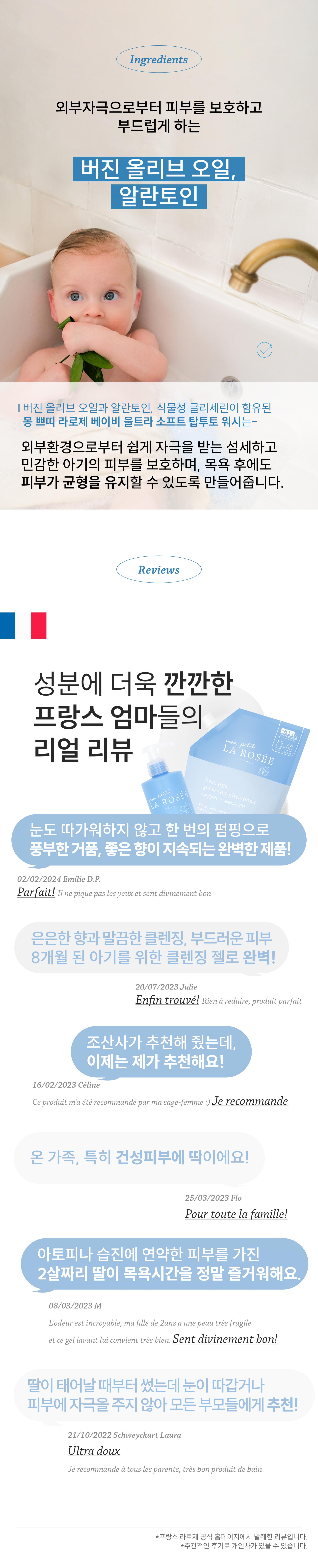 정제수, 글리세린, 소듐라우로일글루타메이트, 라우릴글루코사이드, 코코-글루코사이드, 코카미도프로필베타인, 향료, 글리세릴올리에이트, 아크릴레이트/C10-30알킬아크릴레이트크로스폴리머, 스타이렌/아크릴레이트코폴리머, 프로필렌글라이콜, 소듐벤조에이트, 시트릭애씨드, 폴리쿼터늄-10, 테트라소듐글루타메이트다이아세테이트, 알란토인, 올리브오일, 소듐클로라이드, 토코페롤, 하이드로제네이티드팜글리세라이즈시트레이트