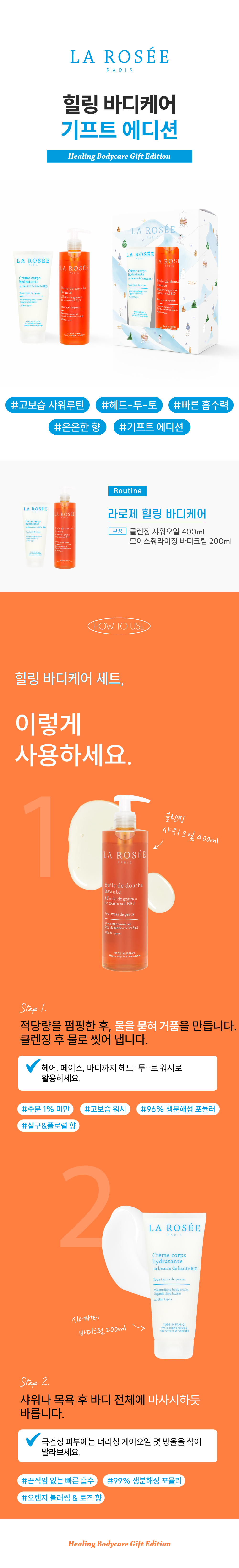 샤워오일 : 손에 적당량을 펌핑한 후, 물을 묻혀 거품을 만들어 줍니다. 클렌징 후 물로 씻어냅니다./ 바디크림 : 아침 저녁 샤워나 목욕 후, 바디 전체에 마사지하듯 발라 줍니다.