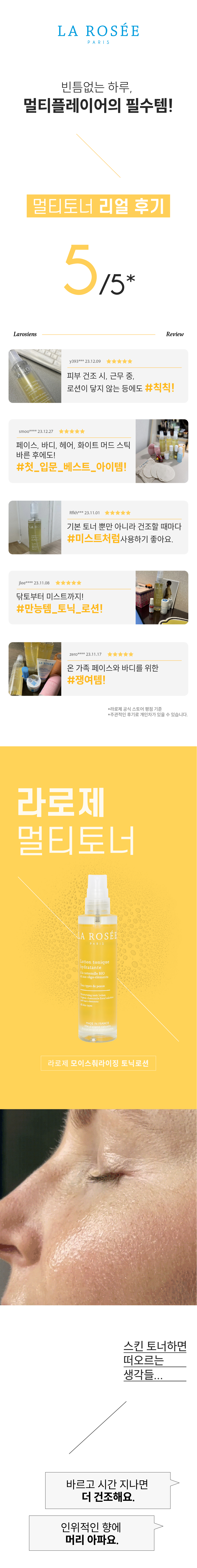 토닉로션 - 정제수, 다마스크장미꽃수, 프로판다이올, 펜틸렌글라이콜, 이눌린, 글리세린, 향료, 테트라소듐글루타메이트다이아세테이트, 씨솔트, 캐모마일꽃수, 소듐벤조에이트, 시트릭애씨드, 허니서클꽃추출물, 포타슘솔베이트, 실리카, 리날룰