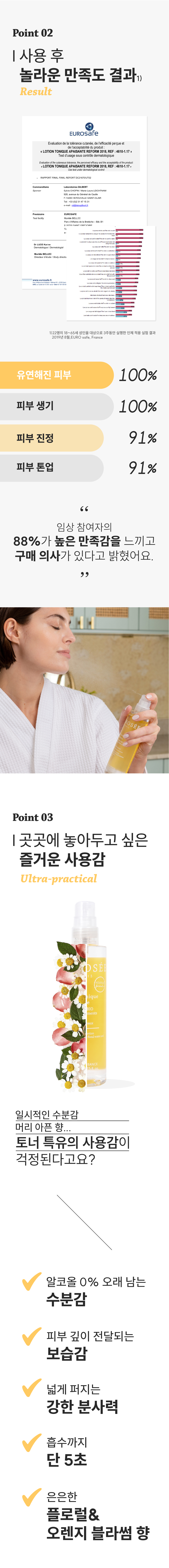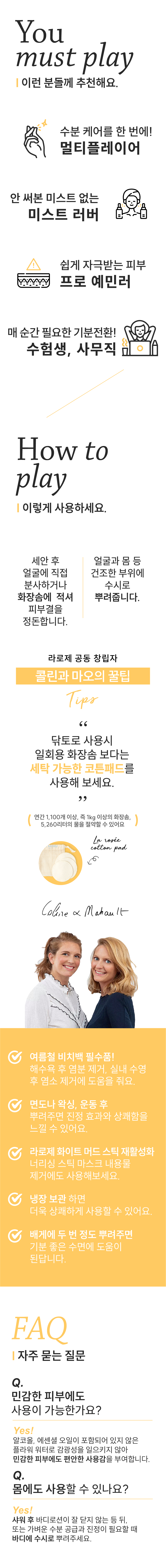 토닉로션: 세안 후 얼굴에 직접 분사하거나, 화장솜에 적셔서 피부결을 정돈해 주세요. / 수분스틱 - 눈가나 건조한 곳 어디든 발라주세요.