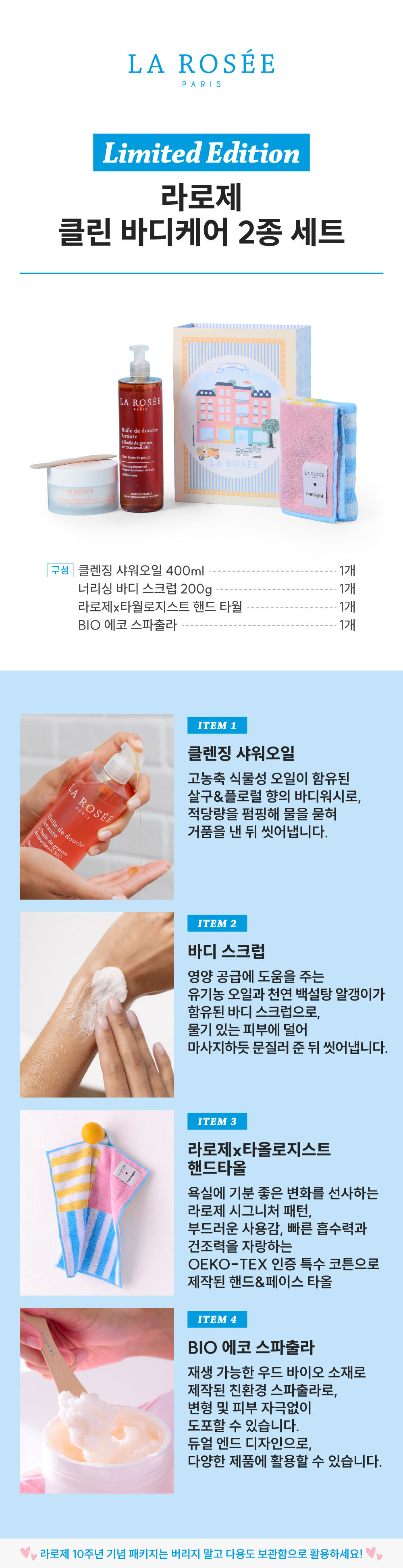 탑투토 워시: 정제수, 글리세린, 소듐라우로일글루타메이트, 라우릴글루코사이드, 코코-글루코사이드, 코카미도프로필베타인, 향료, 글리세릴올리에이트, 아크릴레이트/C10-30알킬아크릴레이트크로스폴리머, 스타이렌/아크릴레이트코폴리머, 프로필렌글라이콜, 소듐벤조에이트, 시트릭애씨드, 폴리쿼터늄-10, 테트라소듐글루타메이트다이아세테이트, 알란토인, 올리브오일, 소듐클로라이드, 토코페롤, 하이드로제네이티드팜글리세라이즈시트레이트 페이스&바디 크림: 정제수, 프로판다이올, 시어버터, 글리세린, 폴리글리세릴-6다이스테아레이트, 피마자씨오일, 올리브오일, 펜틸렌글라이콜, 소듐폴리아크릴레이트, 향료, 호호바에스터, 토코페릴아세테이트, 하이드로제네이티드캐스터오일, 세틸알코올, 폴리글리세릴-3비즈왁스, 카프릴릴글라이콜, 포타슘세틸포스페이트, 테트라소듐글루타메이트다이아세테이트, 시트릭애씨드, 에틸헥실글리세린, 잔탄검, 카나우바왁스, 알로에베라잎즙가루