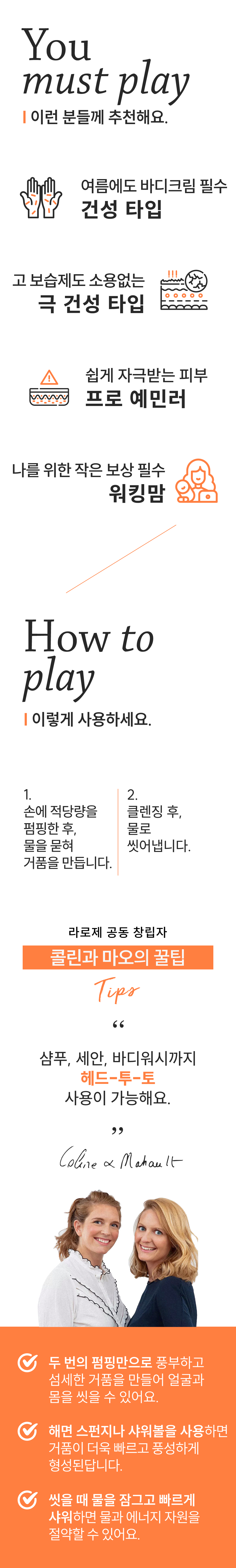 탑투토 워사: 젖은 몸, 얼굴, 모발에 적당량을 펌핑해 거품을 내어 마사지하듯 부드럽게 클렌징 후 물로 씻어냅니다. 페이스&바디 크림: 아침 저녁 샤워나 목욕 후, 얼굴과 몸 전체에 마사지하듯 발라줍니다.