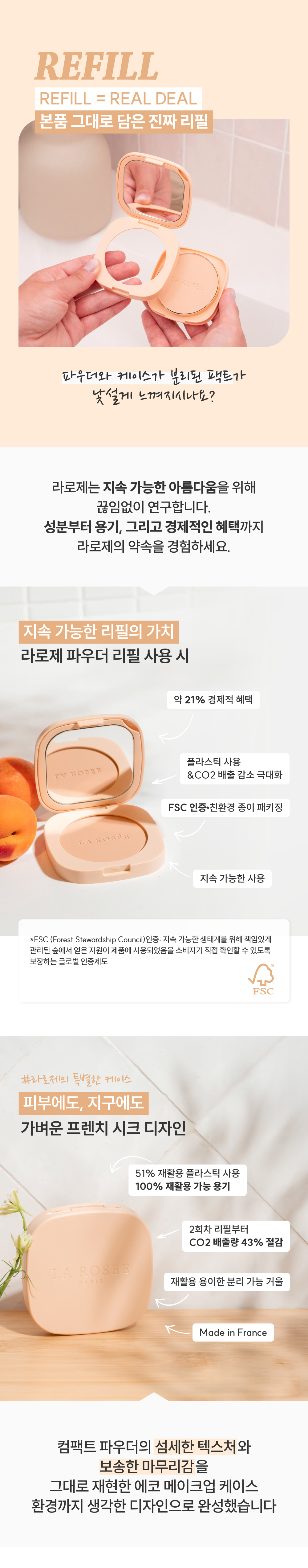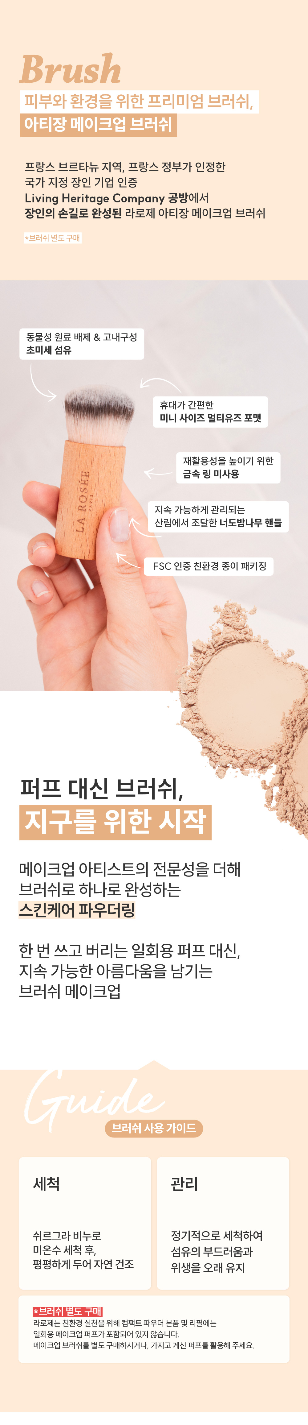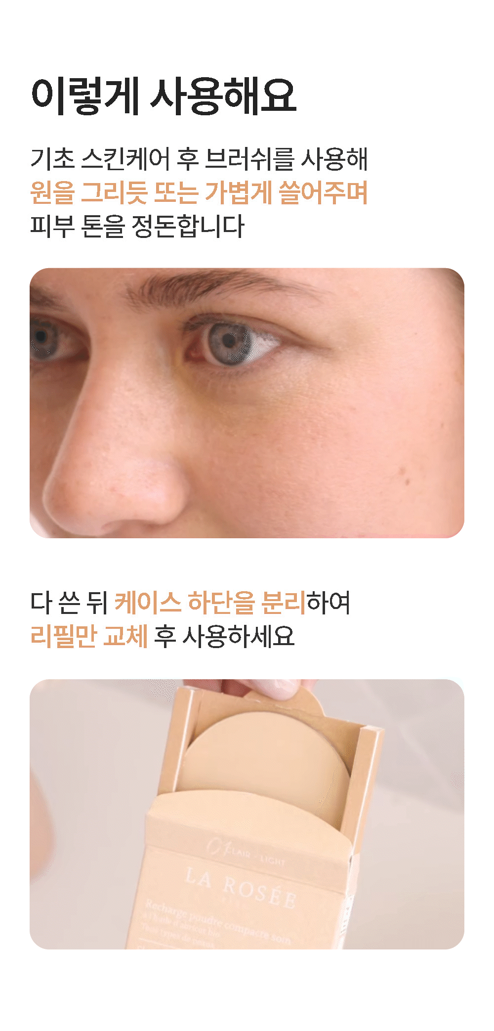 기초 스킨케어 후 브러쉬를 사용해 원을 그리듯 또는 가볍게 쓸어주며 피부 톤을 정돈합니다. 다 쓴 뒤 케이스 하단을 분리하여 리필만 교체 후 사용하세요. TIP : 필요시 덧발라 커버정도를 조절하세요. 레이어링에 따라 더욱 투명하고 은은한 광채를 경험할 수 있습니다.