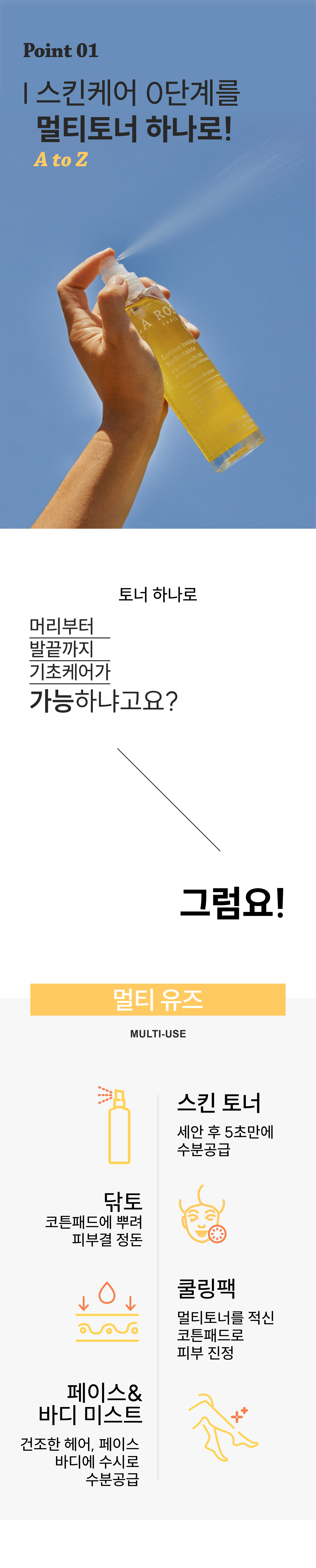 세안 후 얼굴에 직접 분사하거나, 화장솜에 적셔서 피부결을 정돈해 주세요.