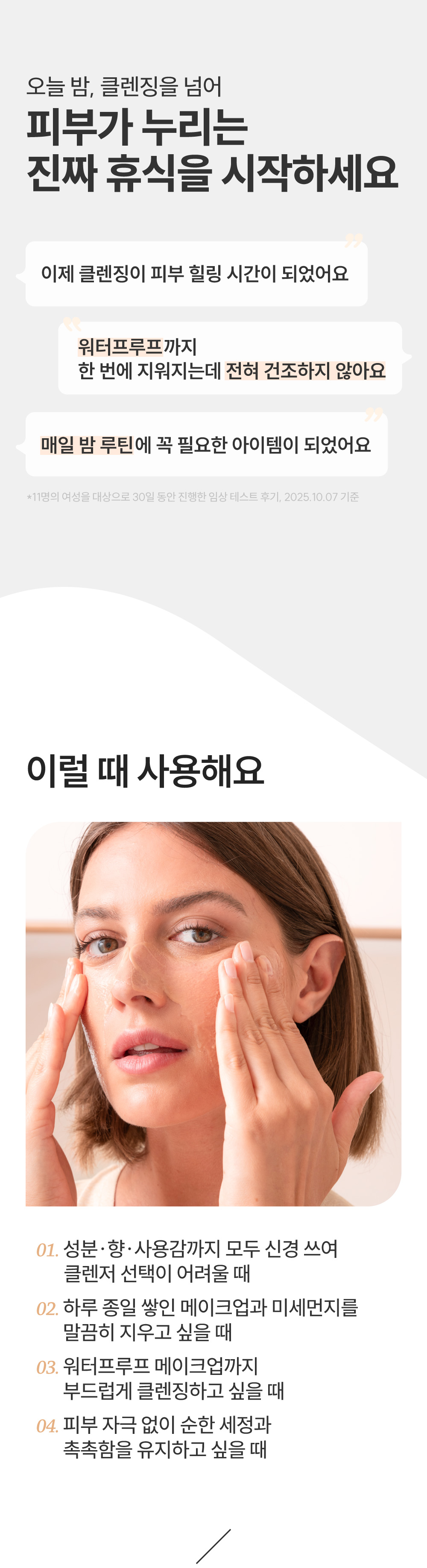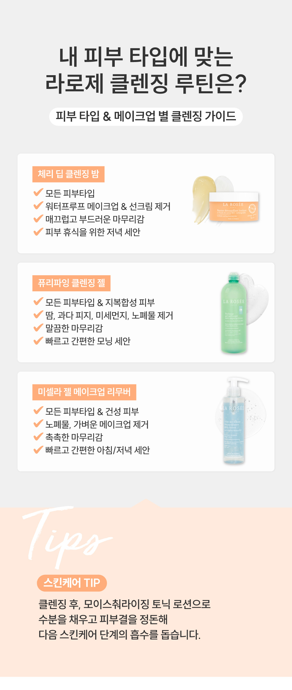 클렌징 젤 : 젖은 얼굴에 적당량을 덜어 거품을 내어 마사지하듯 부드럽게 클렌징 후 물로 씻어냅니다. 클렌징밤 1️. 마른 얼굴에 적당량 덜어 마사지하듯 부드럽게 롤링합니다. 2. 체온에 오일로 녹아내리면 미온수를 더해 밀크 텍스처로 유화시킵니다. 3️. 메이크업과 노폐물을 말끔히 제거 후 헹궈냅니다 4. 다 쓴 후 내부 용기를 들어 올려 리필로 교체 합니다