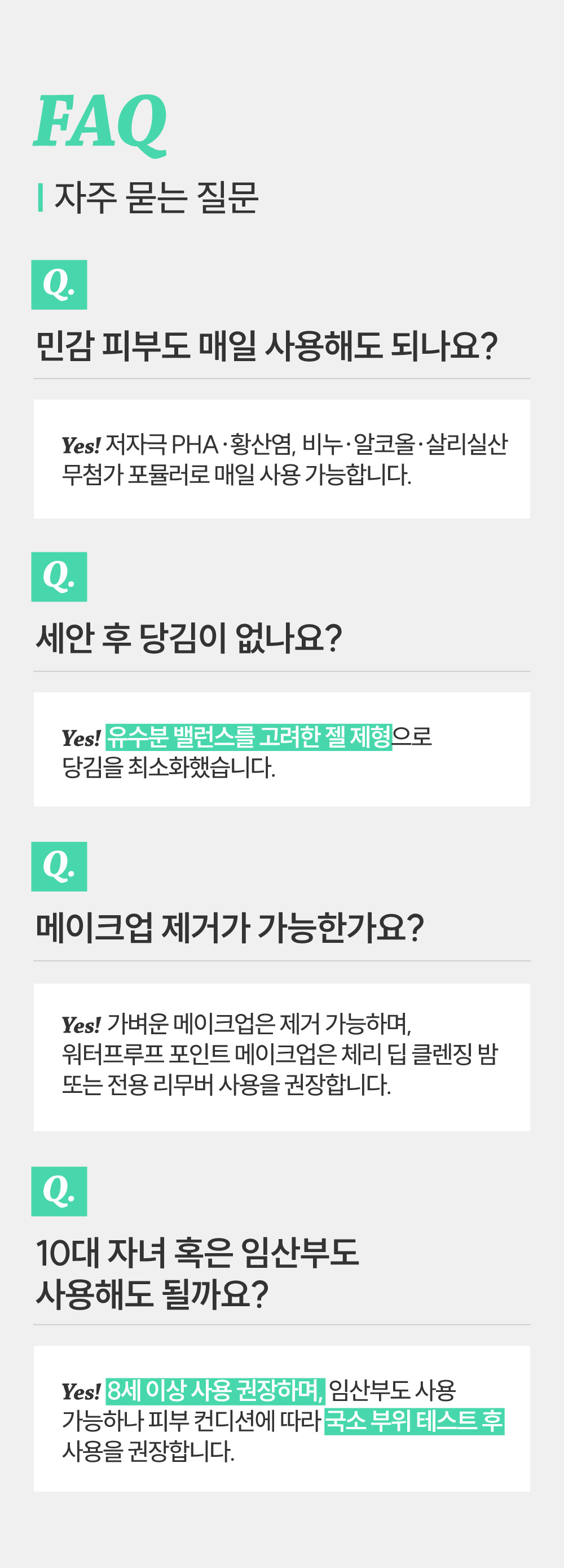 클렌징 젤 : 정제수, 글리세린, 데실글루코사이드, 라우릴글루코사이드, 글루코노락톤, 소듐메틸코코일타우레이트, 징크피씨에이, 잔탄검, 향료, 아라비아고무나무검, 포타슘솔베이트, 소듐벤조에이트, 소듐하이드록사이드, 시트릭애씨드, 자몽추출물
