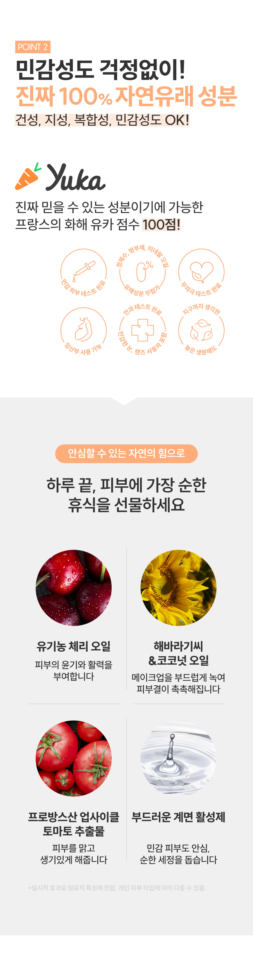 클렌징 밤 : 해바라기씨오일, 코코넛야자오일, 폴리글리세릴-4올리에이트, 베헤닐알코올, C10-18트라이글리세라이즈, 세테아릴알코올, 해바라기씨왁스, 글리세린, 신양벚나무씨오일, 향료, 트라이하이드록시스테아린, 토마토지질, 토코페롤