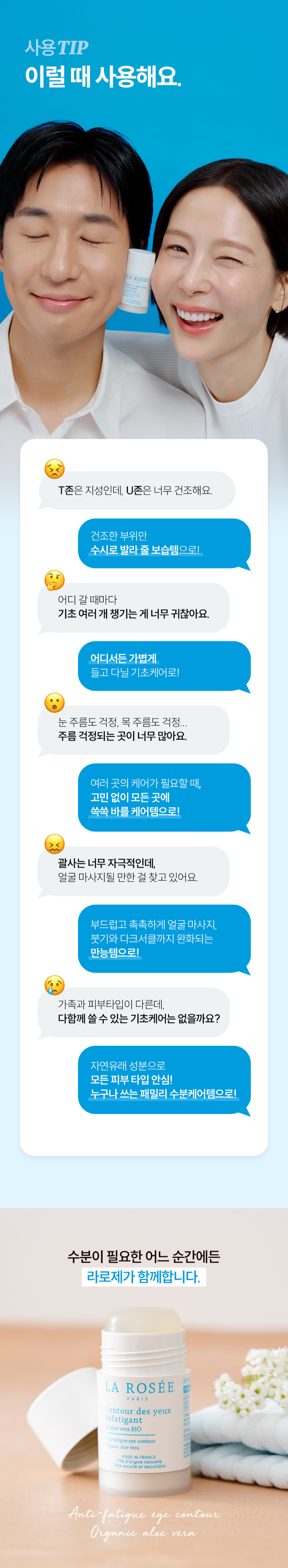 수분스틱 : 눈가가 건조하거나 피로할 때 수시로 발라 줍니다. 입술이나 이마 등 건조한 부위에 부드럽게 바르면 시원한 느낌과 함께 건조함이 해결됩니다. / 너리싱립밤 : 입술에 건조함이 느껴질 때마다 수시로 발라 줍니다. 다 쓴 립밤의 안쪽 스틱을 살짝 당겨 분리 후, 새 리필을 끼워 줍니다. / 틴트립밤 : 입술에 건조함이 느껴질 때마다 수시로 발라 줍니다. 다 쓴 립밤의 안쪽 스틱을 살짝 당겨 분리 후, 새 리필을 끼워 줍니다. 얇게 바르면 내추럴한 컬러로, 덧바를수록 진한 레드 컬러로 발색 조절. 볼에 블러셔로 활용 가능.