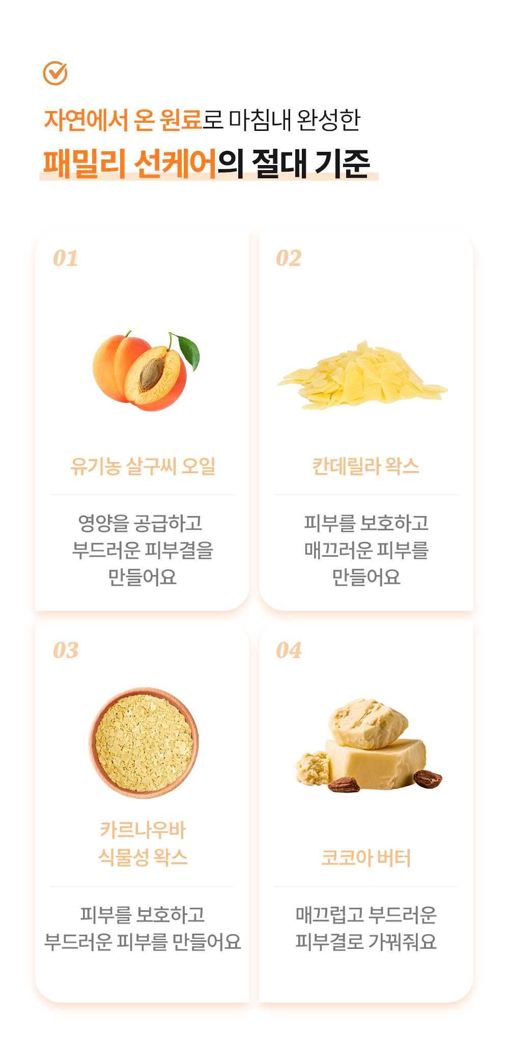 선스틱 - 코코-카프릴레이트/카프레이트, 칸데릴라왁스, 옥틸도데칸올, 디에칠아미노하이드록시벤조일헥실벤조에이트, 비스-에칠헥실옥시페놀메톡시페닐트리아진, 카나우바왁스, 카프릴릭/카프릭트라이글리세라이드, 에칠헥실트리아존, 옥수수전분, 카카오씨버터, 향료, 살구씨오일, 밀배아오일, 해바라기씨오일, 토코페롤 / 수분스틱 - 프로필렌글라이콜, 글리세린, 정제수, 다마스크장미꽃수, 소듐스테아레이트, 프로판다이올, 귀리커넬추출물, 에버라스팅꽃수, 소듐하이드록사이드, 서양송악잎/줄기추출물, 소듐벤조에이트, 시트릭애씨드, 포타슘솔베이트